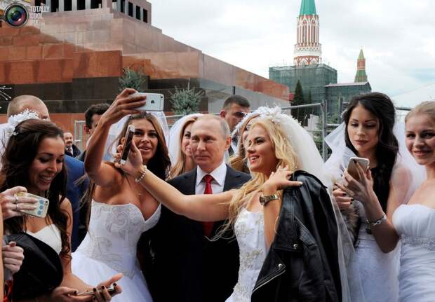 Президент России Владимир Путин фотографируется с невестами во время празднования Дня города на Красной площади в Москве.